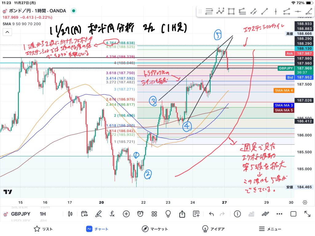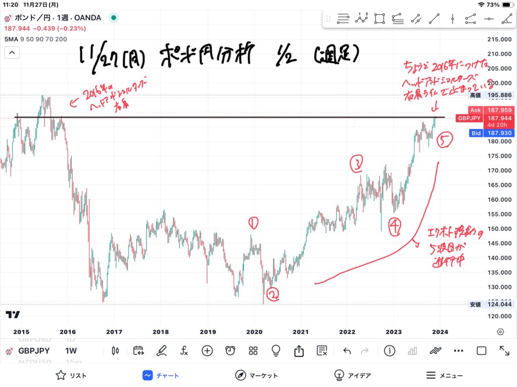 エリオット波動から分析すると上昇波の終焉が近く、今後下降する可能性が考えられるためです。
