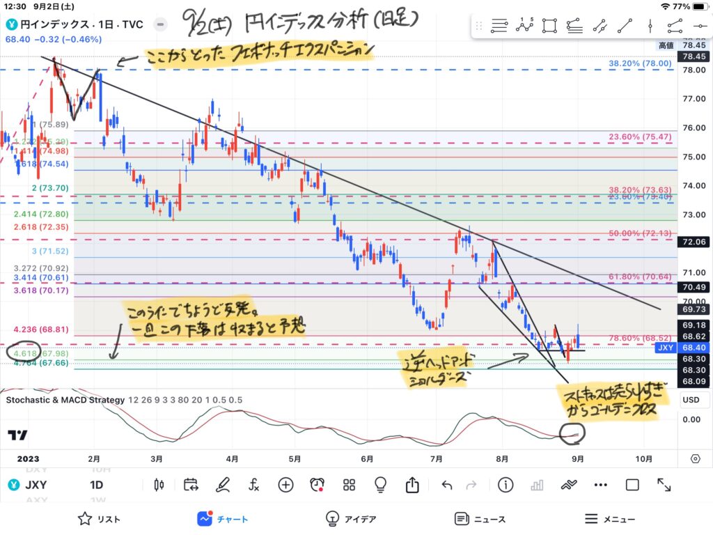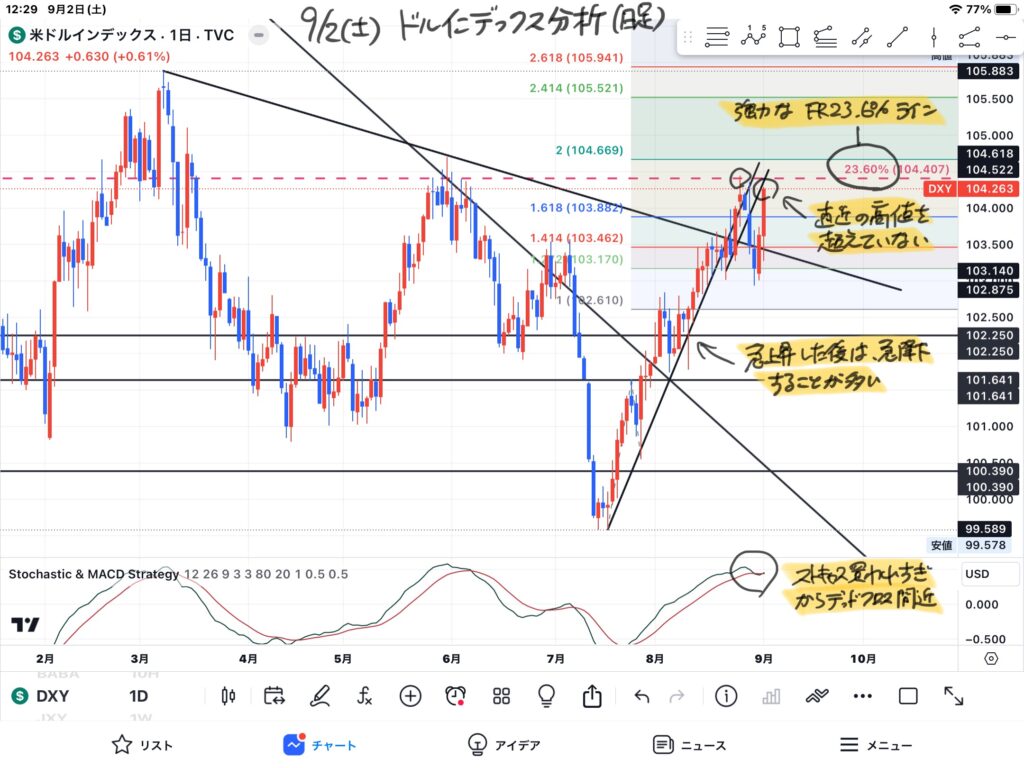 ただ、日足チャート上、ストキャスが買われすぎでデットクロスしそうなところと、直近の高値に迫ってはいますが抜けていないところには注目しておいたほうがいいです。直近高値はFR(フェボナッチリトレースメント)の23.6%ラインでちょうど反応し下落しました。ここはこの画像には写っていないですが、大きな上昇波からとったFRラインで、強いレジスタンスラインになっています。過去にもこのラインを超えられず下落しているのが分かります。ここを抜けられない場合、おそらくドルは下落していくでしょう。