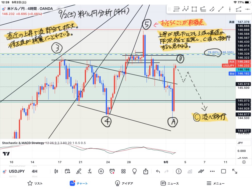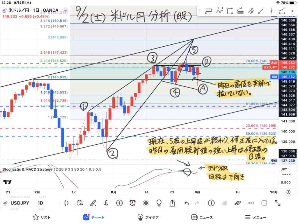 ただ、この上昇はテクニカル的にいうと修正波であるB波の上昇になるため、想定された上昇といえます。日足で見ると、木曜日の高値をローソク足の実戦では抜いていないのと、ストキャスティクス買われすぎラインからデットクロスしているため目線は下で、来週以降は修正波のC波に移行すると思われ、下落に転じるではないかと思われます。